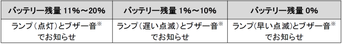 バッテリーの残量が20%を切ると、お知らせランプが点灯し、「ピピッピピッ」とブザー音が鳴るため、目と耳で残量の低下を確認することができ、突然の電池切れを防ぎます。また、バッテリーの残量が、10段階のインジケーターと%で表示されるため、従来モデルに比べて残量を確認しやすくなりました。