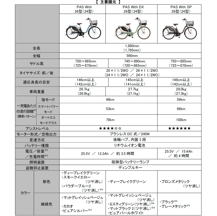 「PAS With」は、幅広いシーンで使いやすいデザインと機能を備えた「PAS Withシリーズ」内で最軽量のスタンダードモデルです。「PAS With DX」は、「籐風ナチュラルバスケット」「クラシカルテリーサドル」など細部までこだわったファッショナブルなモデルです。「PAS With SP」は、「PASシリーズ」最上位のアシストレベルによる優れた登坂性能、大容量バッテリー(15.4Ah)の搭載、大容量エレガントバスケット(約24L)の採用など、パワフルかつ実用機能に優れたプレミアムモデルです。