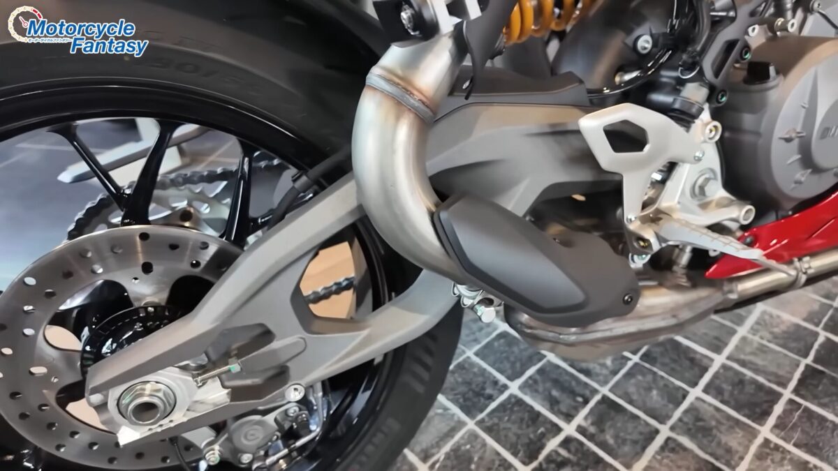 ブレーキにはブレンボ製のモノブロックキャリパーを装備し、強力かつコントロールしやすい制動力を発揮。サスペンションはややオフセットされた配置となっており、排気レイアウトとのバランスも考慮されている。見た目のレーシーさだけでなく、日常でも扱いやすい実用的な足まわりに仕上げられている。