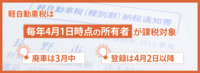 4月1日の最終の所有状況で判断されるため、4月1日以前に廃車手続きを完了させると、その年度の軽自動車税を納める必要がなくなります。4月2日以降に手続きした場合、その年度の軽自動車税の支払いが必要です。基本的には、3月末までに廃車手続きを完了させるようにしましょう。