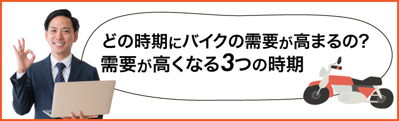 バイクは暖かい時期の長期休暇、および新生活シーズンの直前に高値が付きやすくなります。また、梅雨時などの悪天候が続くシーズンの場合、バイクを売る方が減るため店舗の在庫が減り、バイクが値上がりする傾向があります。