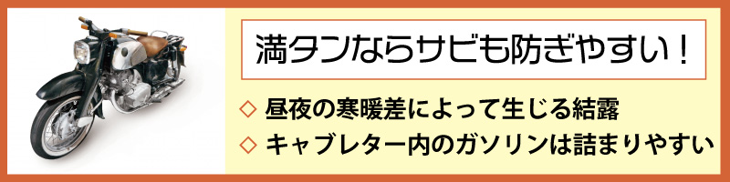 このようなサビを防ぐためには、ガソリンを満タンにし、結露ができる空間を無くしておくことが有効です。