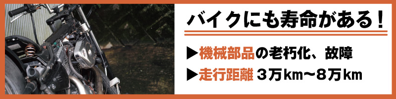 バイクは使用していくうちにどうしても内部の劣化が進行していき、走行距離が多くなれば故障も増加して寿命を迎えます。