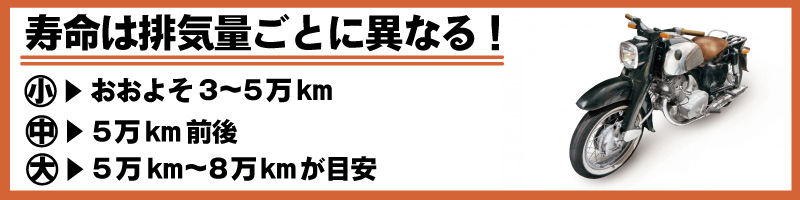 小排気量のバイクの場合、走行距離での寿命の目安はおおよそ3〜5万kmと言われていますが、2万km程度で寿命を迎える場合も少なくありません。
