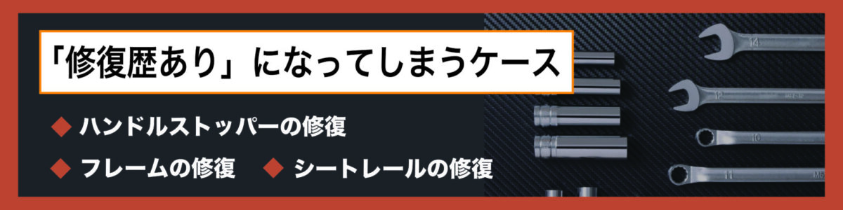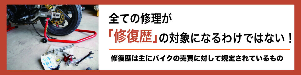 ここでいう修復歴は主にバイクの売買に対して規定されているものであり、タイヤ交換のような細かな修理は基本的に含まれておらず、フレームのようなバイクの基幹部品に対する修理の有無を指します。