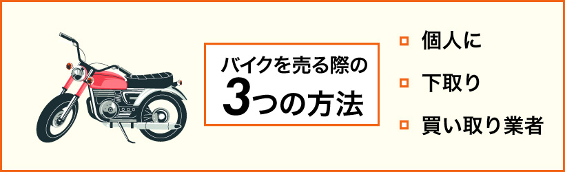 バイクを売る際の選択肢として、大きく分けて個人に売る・バイク販売店に下取りに出す・バイク買取業者に売るという3つの方法があります。それぞれ特徴とメリットが異なるため、状況に応じて選択することが重要です。