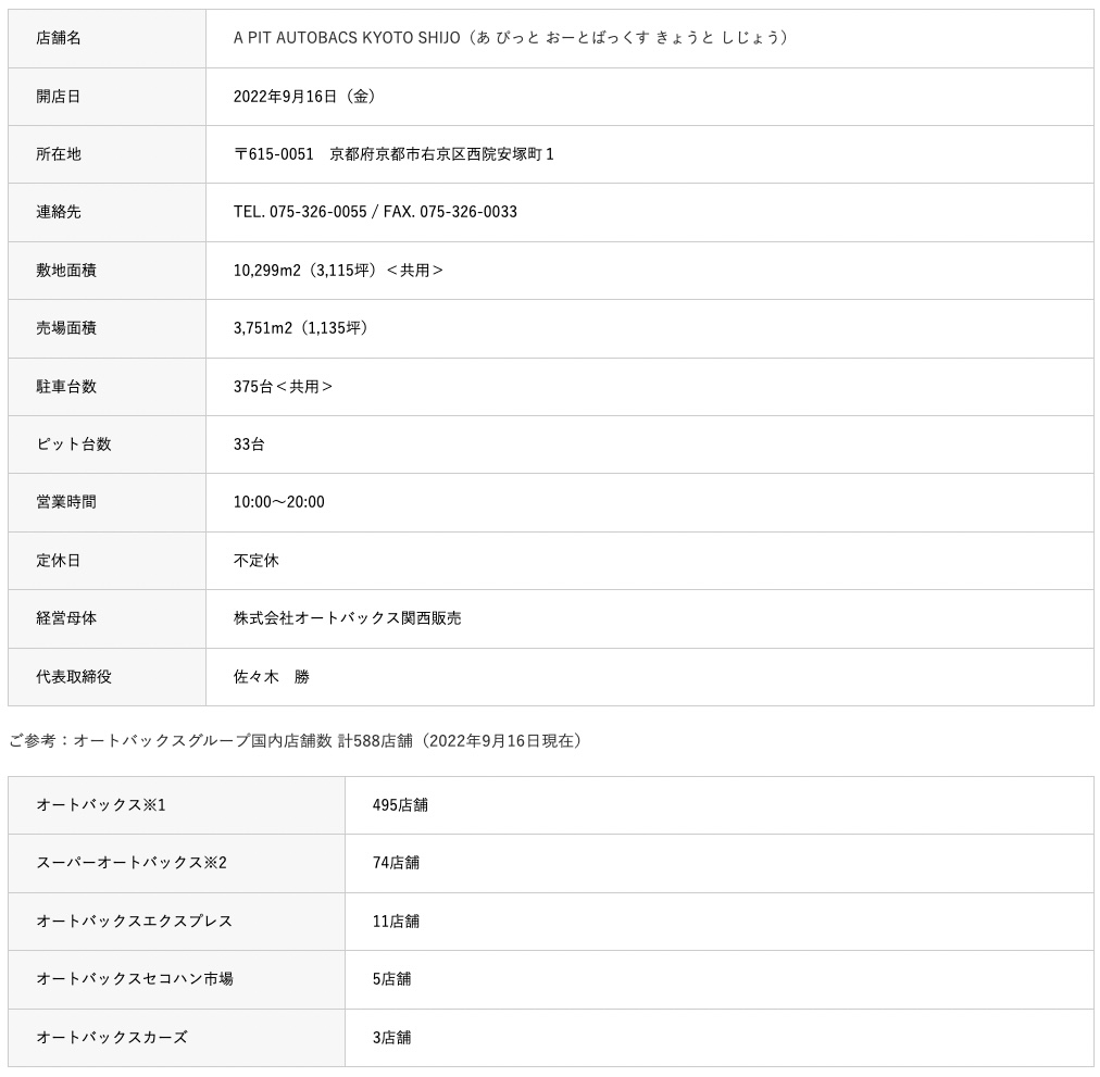 株式会社オートバックスセブンと加盟店契約を結んでいる株式会社オートバックス関西販売は、オートバックスグループのフラッグシップ店舗「スーパーオートバックス京都ワウワンダーシティ」をリニューアルし、2022年9月16日(金)に、「A PIT AUTOBACS KYOTO SHIJO」としてオープンいたします。