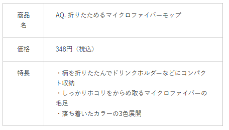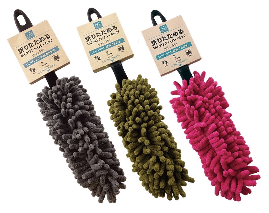- ドアポケットやドリンクホルダーなどにもコンパクトに収納可能な「AQ. 折りたためるマイクロファイバーモップ」を3色展開します