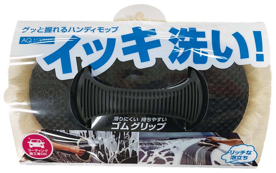 - 「AQ. グッと握れるハンディモップ」は、ムートン調生地でボディにやさしく、グッと握れる持ち手と幅広いモップ面で効率的に洗車できるスポンジです