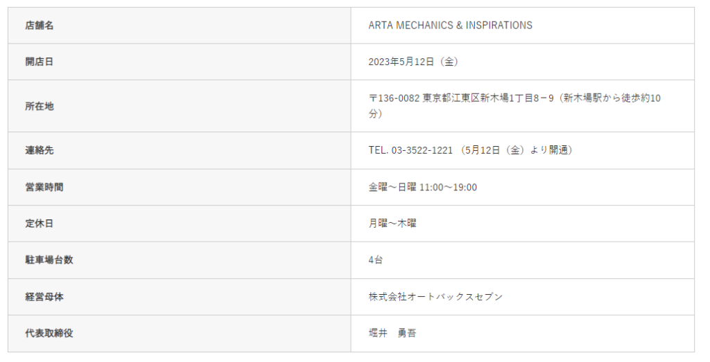 株式会社オートバックスセブン(代表取締役 社長執行役員:堀井勇吾)がスポンサードしているレーシングスポーツブランド「ARTA」は、ブランド初のコンセプトストア「ARTA MECHANICS & INSPIRATIONS(エーアールティーエー メカニクス アンド インスピレーションズ)」を2023年5月12日(金)、東京都江東区に出店いたします。