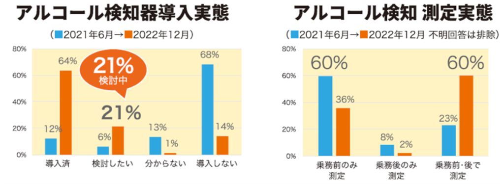 ・前回調査では「アルコール検知器導入済み」が12%だったが、今回調査で64%へと大幅に増加