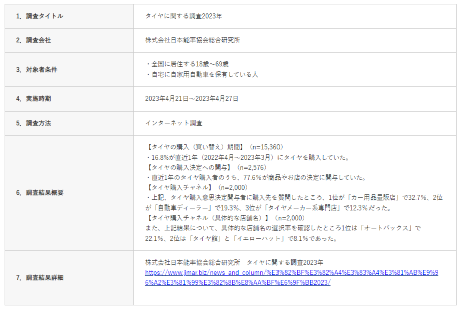 株式会社オートバックスセブン(代表取締役 社長:堀井勇吾)は、株式会社日本能率協会総合研究所(以下、JMAR)が実施する「タイヤに関する調査(2023年)」において、オートバックスが7年連続でタイヤ購入先として選ばれた販売店No.1となりましたので、お知らせします。