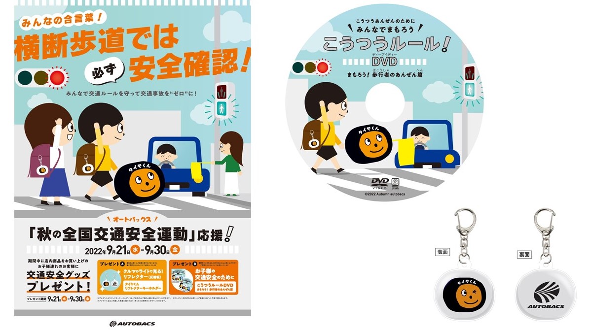 株式会社オートバックスセブンは、内閣府が主催する「令和4年秋の全国交通安全運動」に合わせ、9月21日(水)~9月30日(金)の期間中、全国のオートバックス、スーパーオートバックス店舗にて交通安全運動の啓蒙活動を実施する。期間中、店舗へ来店した子どもには、夜間のライトなどを反射するリフレクターキーホルダーをプレゼントする。また、2,200円(税込)以上の購入で「安全・安心なクルマ社会」をテーマにした交通安全啓蒙DVDを進呈する(一部店舗を除く)。