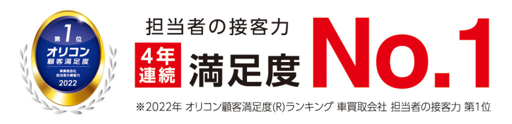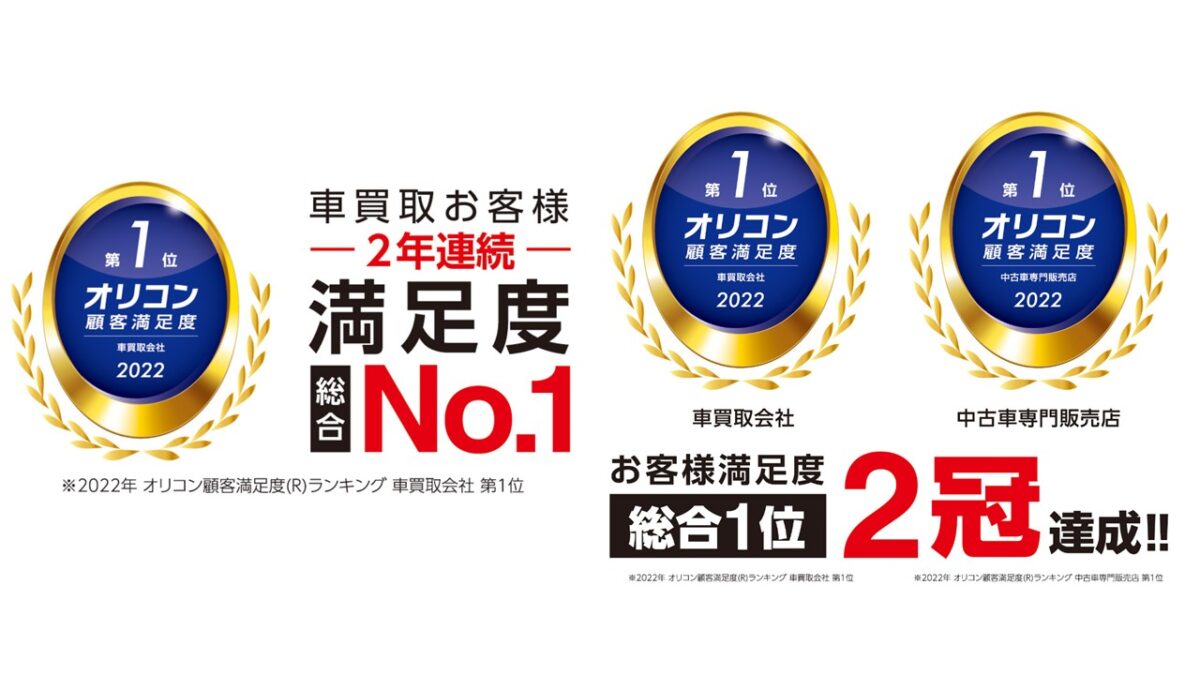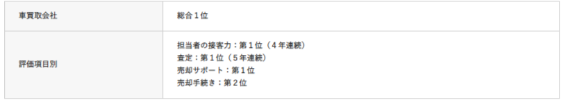 「中古車専門販売店」総合1位と合わせて「2冠」を達成した。「車買取会社」ランキングは、過去5年以内に実際にサービスを利用したことのあるユーザーを対象に、満足度について4つの評価項目をインターネット調査ににて行う。評価項目の内、「担当者の接客力」は4年連続第1位、「査定」「売却サポート」についても第1位に選出された。