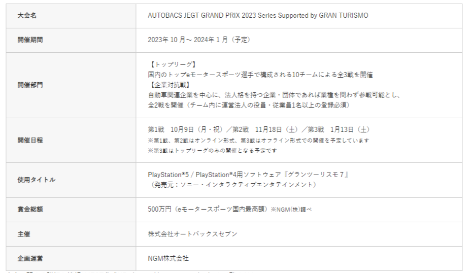 株式会社オートバックスセブンは、eモータースポーツの2023年公式シリーズ「AUTOBACS JEGT GRAND PRIX 2023 Series」を開催すると発表した。2022シリーズに続き「TEAM BATTLE(団体戦)」に特化した「トップリーグ」と「企業対抗戦」の2部門を実施。トップリーグでは1戦ごとに賞金を授与し、また、全3戦で獲得した合計ポイントにより、総合順位の上位チームにも賞金を授与するとしている。企業対抗戦では、法人格を持つ企業・団体であれば業種を問わず参戦可能な企業対抗戦として全2戦を開催する。前大会の平均視聴回数は65,000回以上を記録しており、今大会も、eモータースポーツをより一層盛り上げることを目的としている。