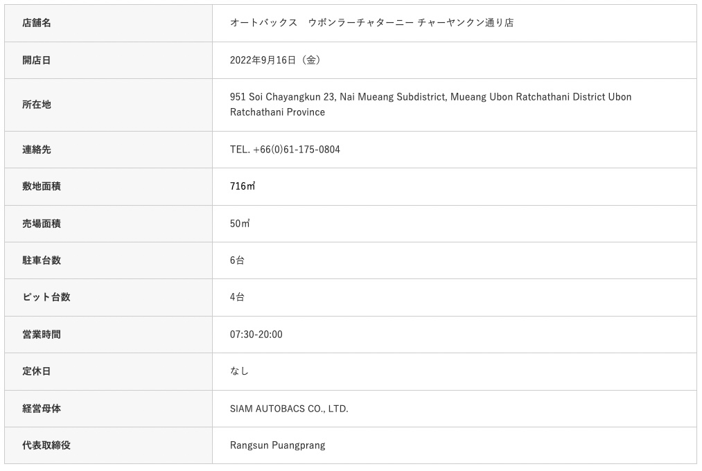 株式会社オートバックスセブン(代表取締役 社長執行役員:堀井勇吾)とタイ国内におけるエリアフランチャイズ契約を締結しているSIAM AUTOBACS CO., LTD.(代表取締役社長:Rangsun Puangprang)は、2022年9月16日(金)に「オートバックス ウボンラーチャターニー チャーヤンクン通り店」を新規オープンいたしました。