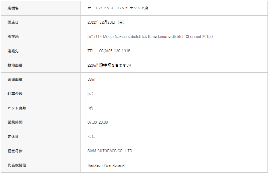 株式会社オートバックスセブン(代表取締役 社長執行役員:堀井勇吾)とタイ国内におけるエリアフランチャイズ契約を締結しているSIAM AUTOBACS CO., LTD.(代表取締役社長:Rangsun Puangprang)は、2022年12月23日(金)に「オートバックス パタヤ ナクルア店」を新規オープンいたしました。