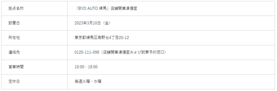 店舗出店までの間、店舗開業準備室を東京都練馬区に設置し、2023年3月10日(金)よりe-SUV「BYD ATTO 3(アットスリー)」の体験試乗・購入予約受付を開始いたします。