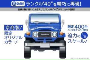 老舗ホビーメーカー「京商」とコラボ製作した『“トヨタランドクルーザー40系”1/18スケールミニカー』のクラウドファンディングサービス「CAMPFIRE(キャンプファイヤー)」オリジナルカラー(青×白)を400台限定展開します。