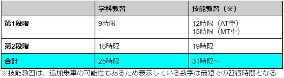 上記のとおり、学科教習を25時限分、実車による技能教習を31時限分以上受けることとなります。