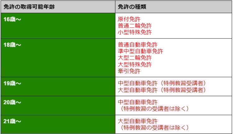 運転免許の種類別で、取得できる年齢を一覧表にまとめてみました。