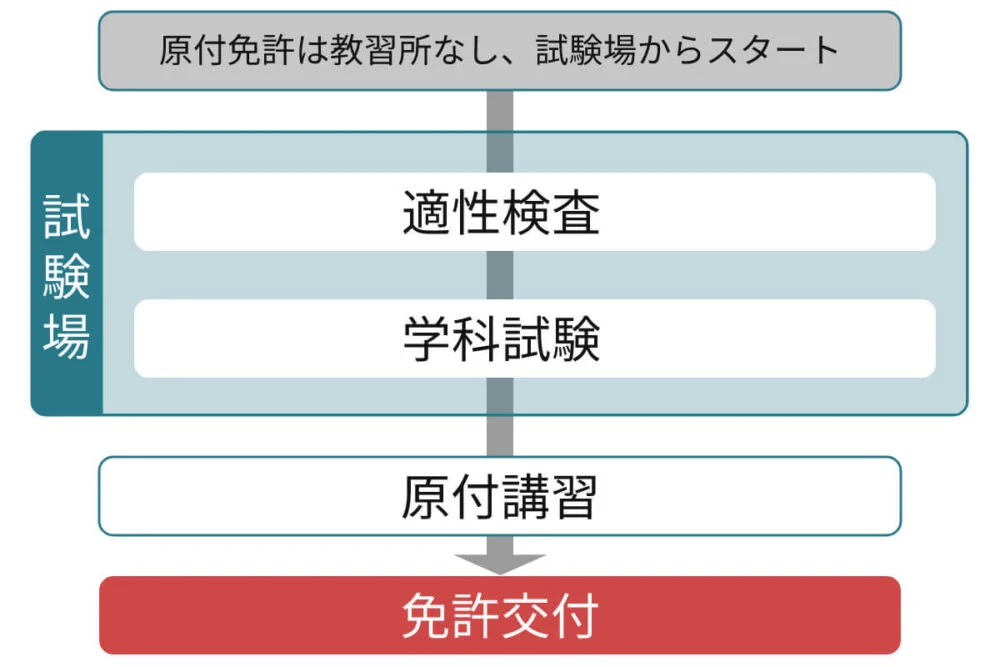 原付免許・小型免許の試験の流れは、まず学科試験を受け、その点数が合格点に達していればその後原付講習に参加し、その上で免許証が交付されるというものです。