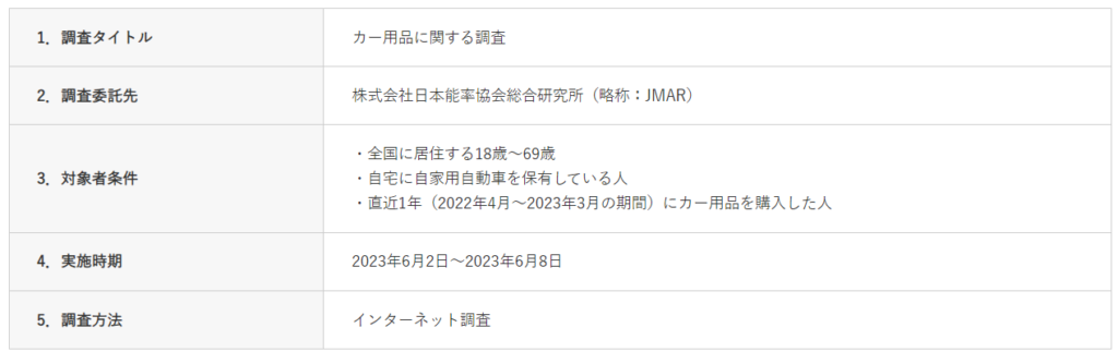「カー用品に関する調査」は、官公庁・民間企業向けの調査研究事業、ビジネス情報提供サービス事業を行うJMARに委託し、2023年6月にカー用品の購入実態を把握するために行ったインターネット調査です。自宅に自家用自動車を保有し、かつ直近1年にカー用品を購入した、全国の18歳から69歳の方(n=7,649)を対象に行われました。