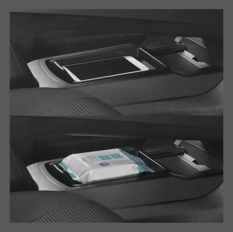 大きめのスマートフォンにも対応したスライド式トレイ。助手席に座った人のスマートフォンやウェットティッシュなど、運転席や助手席から手が届きやすく取り出しやすい位置に置ける