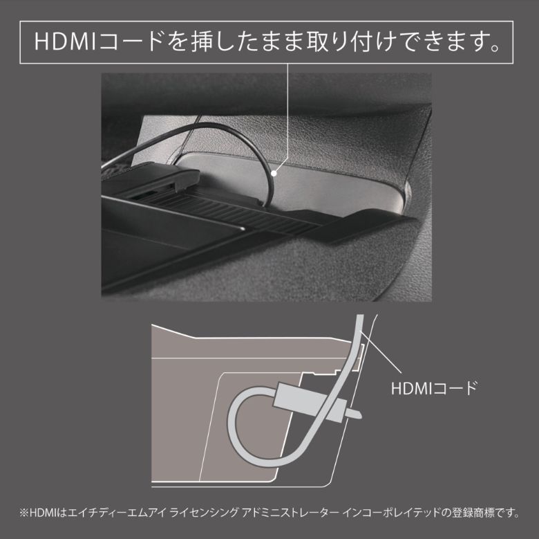 コンソール下のHDMI端子(オプション装備)にコードを挿した状態でも本製品を使用可能。スマホに保存した動画や写真、音楽などをオーディオシステムで楽しむ際も邪魔にならない