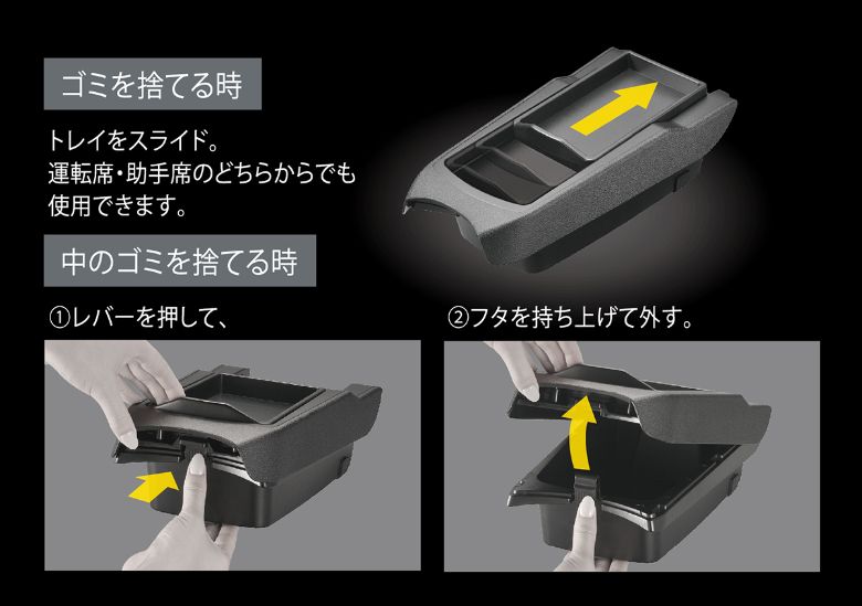 運転席からの使いやすさを考慮。スマートになじむゴミ箱&トレイ