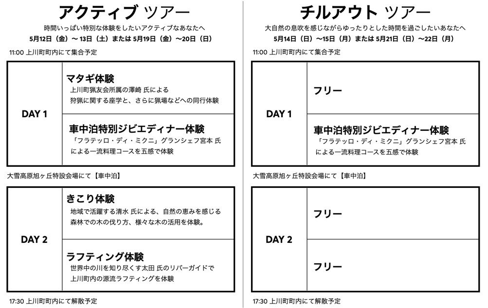 これまでの取り組みで得た知見・調査結果を活かし、より差別化され付加価値の高い魅力的なツアー内容となっております。具体的には、初心者・家族連れでもそのまま移動し車中泊ができる点、時間いっぱい特別な体験をしたいアクティブ派と大自然の息吹を感じながらチルアウトしたいゆったり派などのニーズ別設定をしている点などです。地元で活躍されるガイドや一流シェフ、そして、キャラバンとともに、北海道上川町ならでは魅力溢れる体験モニターツアーへのご応募をお待ちしております。