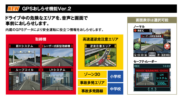 ドライブ中の危険なエリアを、音声と画面で事前におしらせします。
