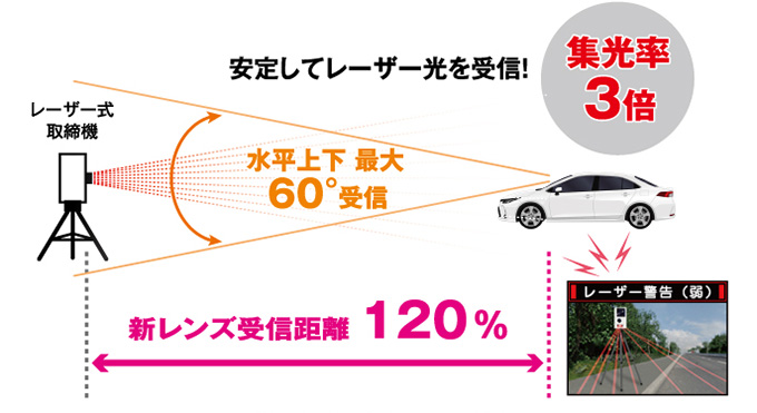 新設計のフレデリックスレンズと当社独自のシステム※を合わせることで、赤外線やレーザー光を使用した機器 など誤警報となりやすい受信とレーザー式オービスからのレーザー受信を高い確率で識別することが可能です。 ※特許出願中