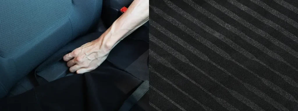3Dシートカバーの座面裏には汎用防水カバーにありがちな乗降時のズレを最小限に抑えるため生地にシリコン加工を施し、座面と背もたれの間にハンドルを挟む事でダブルで滑り止め効果を発揮します。