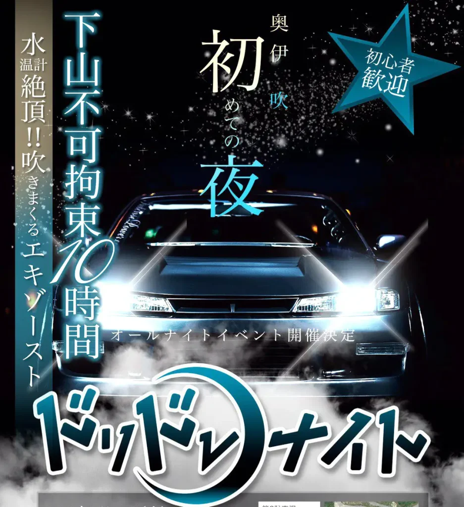 「暗闇の中でアクセル全開」!!「夜から朝まで続く」オールナイトのドリフトイベント「ドリドレナイト」を8月13日(土)夜に奥伊吹モーターパークで開催!