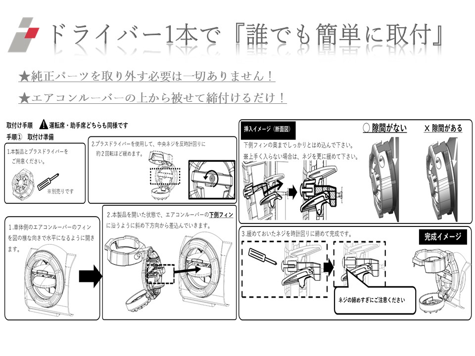 送風口に嵌めこみ、プラスドライバーで1カ所を締め付けるだけ。