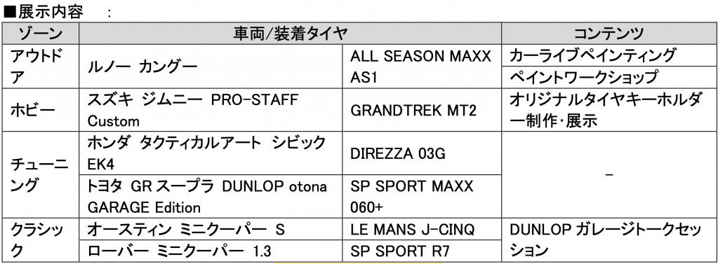 今回のブースでは、「DUNLOP otona GARAGE」をテーマに、こだわりの大人のカーライフをガレージの世界観で表現します。多くの人が一度は憧れるこだわりを詰め込んだガレージを DUNLOP セレクトのタイヤラインアップとともに“アウトドア・ホビー・チューニング・クラシック”の 4 つコンセプトで紹介します。3 日間 かけて行われる画家・松崎大輔氏による展示車両へのライブペイントパフォーマンスや子供も参加できるペイントワークショップ、スペシャルゲストによるこだわりのカーライフをテーマにしたトークショーも予定しています。