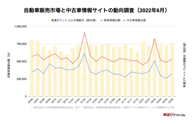 中古車情報サイト「車選びドットコム(https://www.kurumaerabi.com/)」を運営する株式会社ファブリカコミュニケーションズより、2022年6月における自動車登録台数の推移と、中古車情報サイト「車選びドットコム」の販売台数推移から、中古車市場の動きをまとめたレポートを案内する。