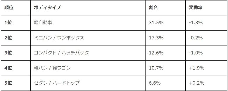 国産車のボディタイプ別ランキングは先月から順位の変動はなかった。上位5ボディタイプの販売割合を見ると、3位までのボディタイプのシェア率が低くなっており、4,5位のボディタイプのシェア率が高くなっている。