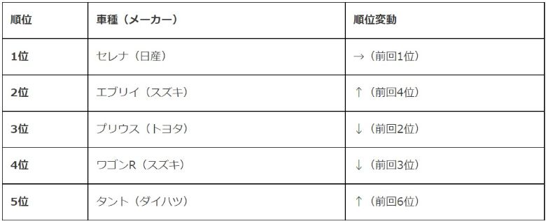 国産車の車種別ランキングを見てみると、セレナ(日産)、エブリイ(スズキ)、プリウス(トヨタ)、ワゴンR(スズキ)、と、上位4車種は変わらない結果だが、順位が少し変動した。しかしその中でもセレナは2022年3月から1位を維持し続けている。