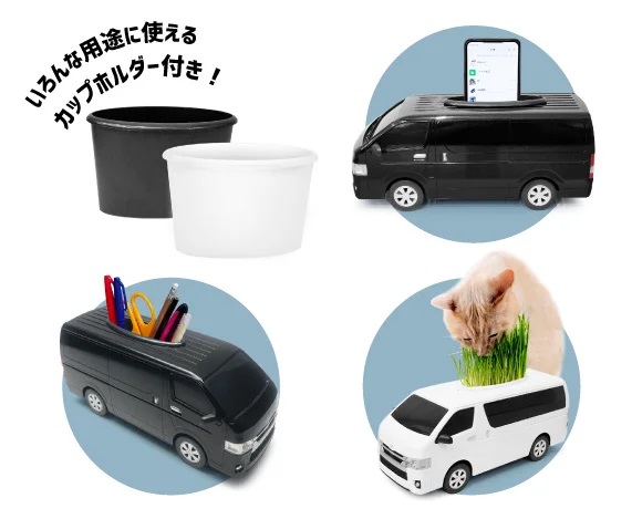 ハイエース型ティッシュケースは袋タイプのティッシュ専用のティッシュケースですが、付属のマルチカップを使用することでペン立てやスマホスタンドなど、小物入れとしても使用することができます。