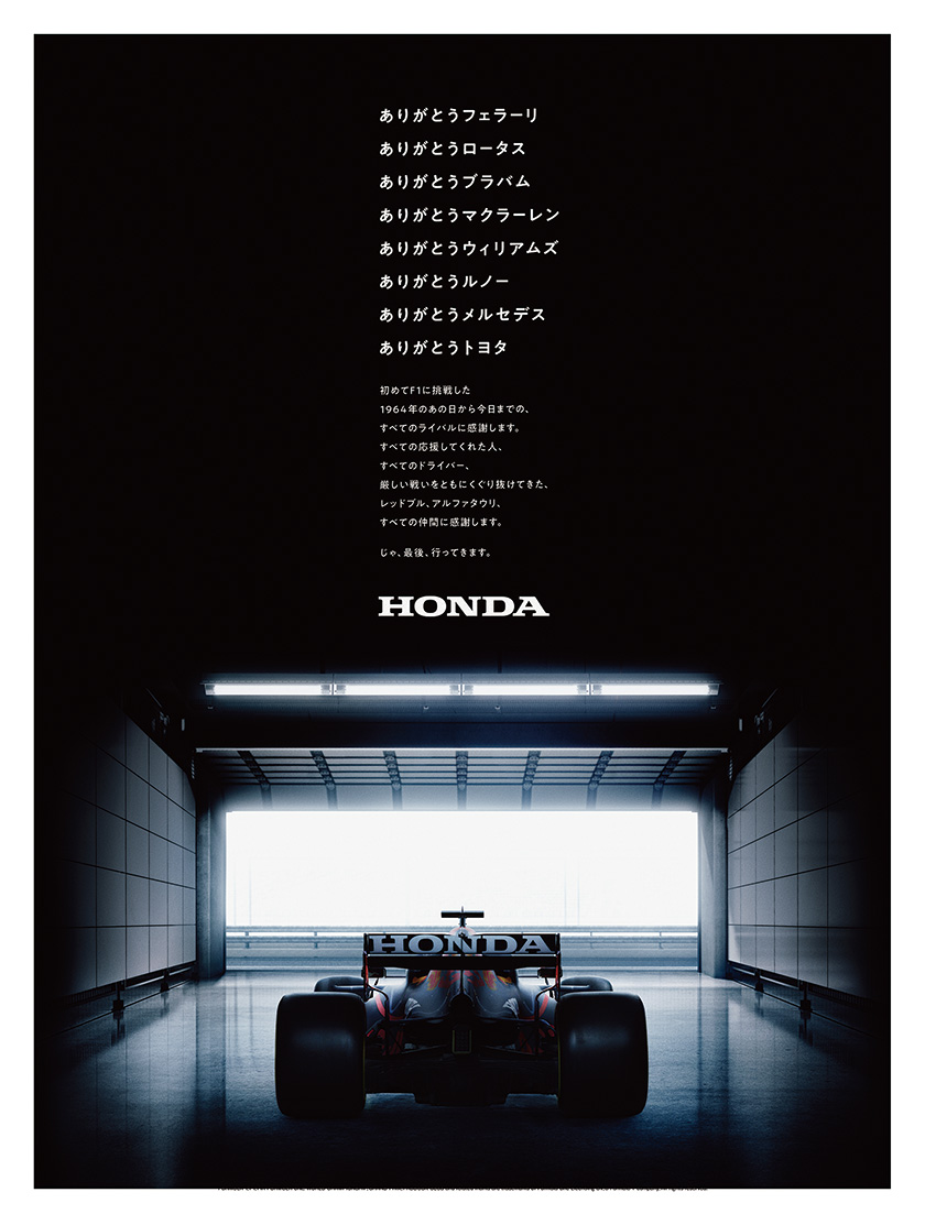 Hondaの企業広告「F1:ラストデー/挑戦って、いいもんだ。」が、株式会社日本経済新聞社が主催する「第71回日経広告賞(2022年)」の「自動車・運輸・輸送部門 最優秀賞」を、「カーボンニュートラル篇」が、同「環境部門 最優秀賞・環境大臣賞」を受賞しました。