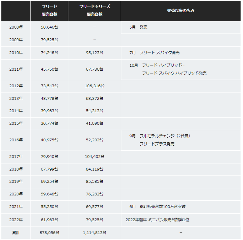 - ※3フリード(3列)、フリード スパイク(2列 2010年7月~2016年6月)、フリードプラス(2列 2016年9月~)