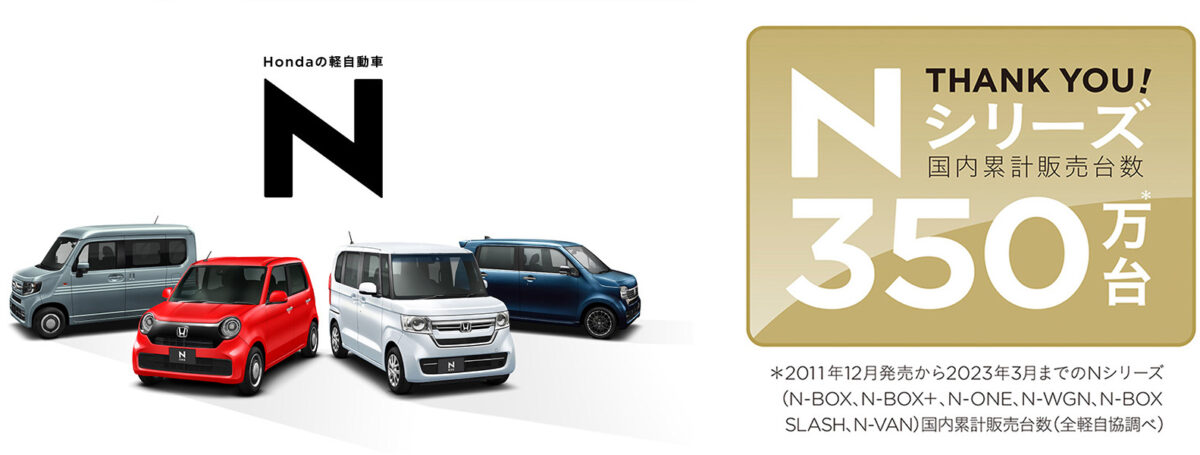 Hondaの軽自動車「N」シリーズ[N-BOX(エヌボックス)、N-ONE(エヌワン)、N-WGN(エヌワゴン)、N-VAN(エヌバン)]の累計販売台数が、2023年3月末時点で350万台を突破しました。2011年12月に初代N-BOXを発売して以来11年3ヵ月(135ヵ月)での記録達成となります。