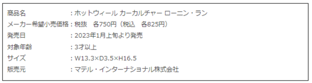 米国マテル社の日本法人であるマテル・インターナショナル株式会社(本社:東京都千代田区、代表取締役社長:マーク・パンサール)は、レーシングカー・スポーツカーで人気を博した車種を集めた「ホットウィール カーカルチャー ローニン・ラン」を2023年1月上旬より発売いたします。