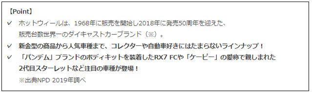 世界No.1のミニカーブランドHot Wheelsから「パンデム」ブランドのボディキットを装着したRX7 FCや、「ケーピー」の愛称で親しまれた2代目スターレットなど、注目の日本車シリーズが新登場!