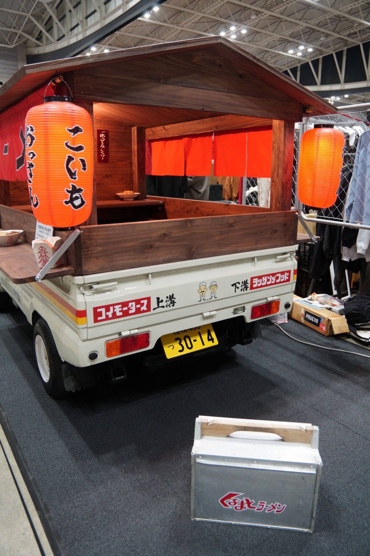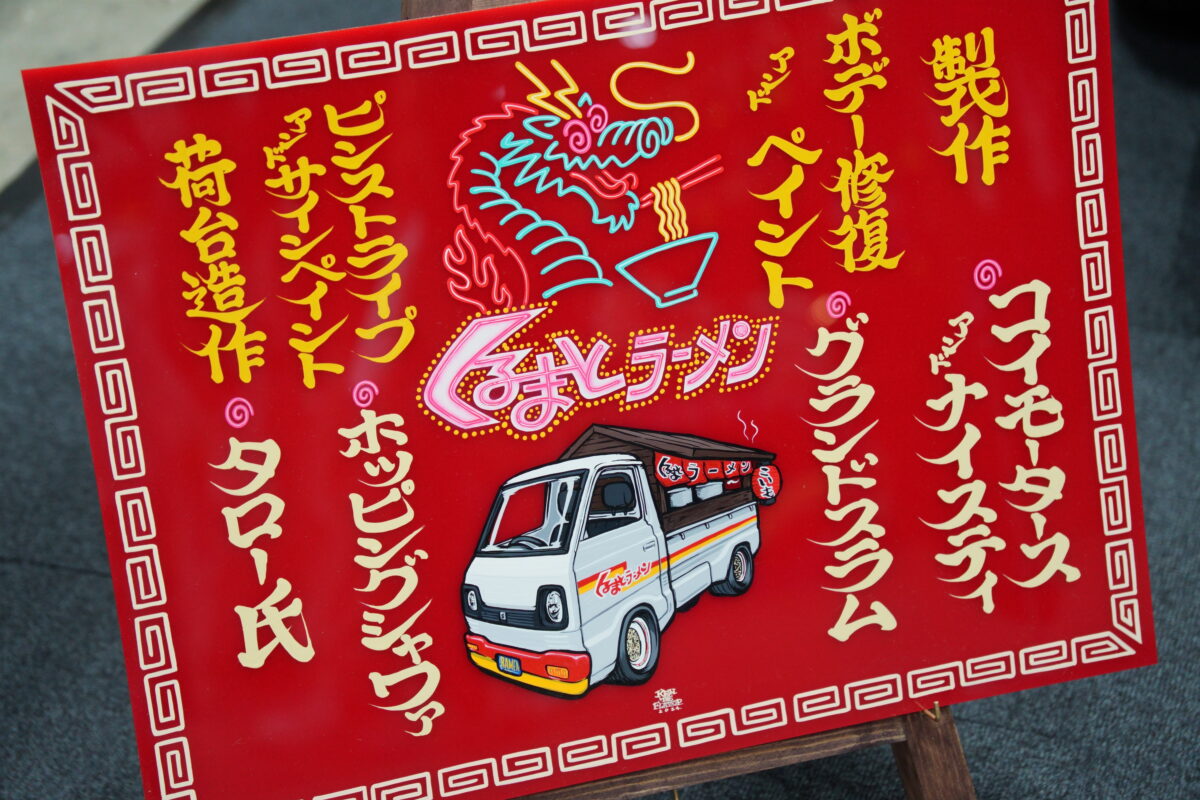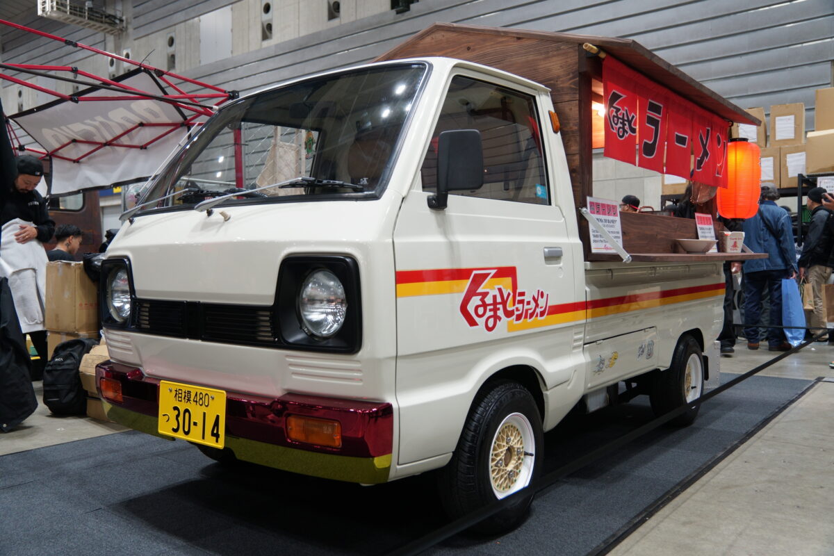 1980年製のスズキ キャリイをベースに、屋台のラーメン屋使用にカスタム。一見すると「くるまやラーメン?」と思ってしまうが、実際には「くるまとラーメン」。ホイールがラーメンを模していたり、オリジナルのアパレルを展開していたりと、こだわりと愛を感じる1台だ。