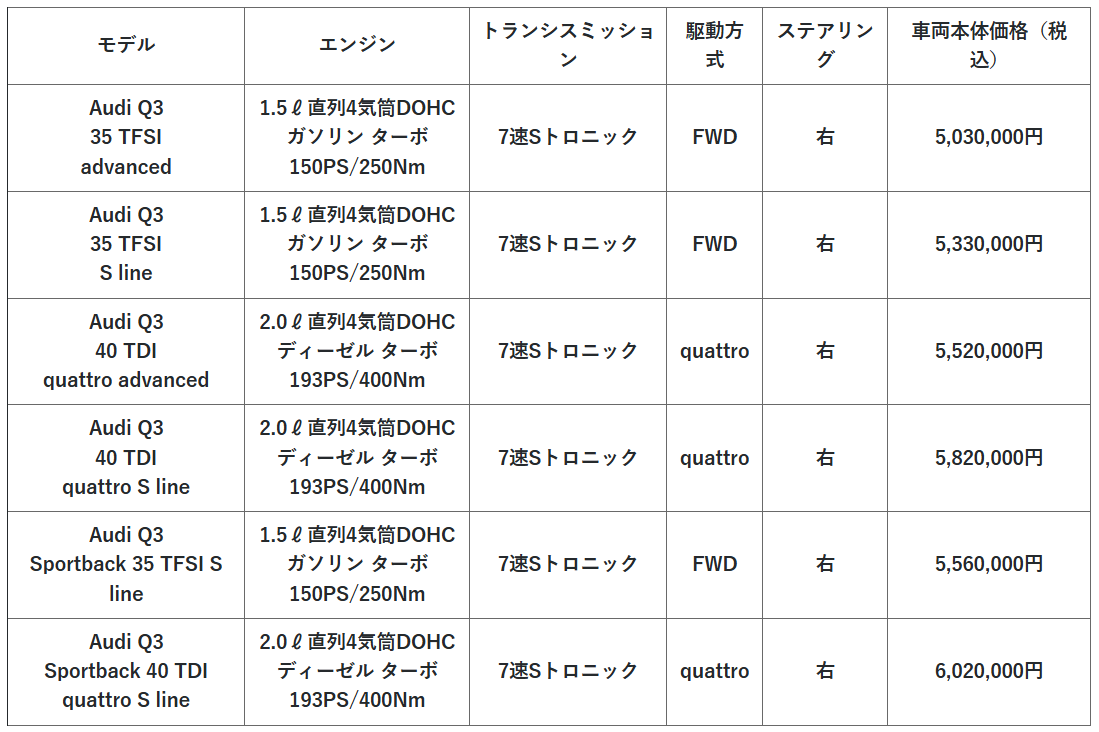 アウディ ジャパン(東京都品川区、ブランド ディレクター:マティアス シェーパース)は、アウディのプレミアムコンパクトSUV/SUVクーペのAudi Q3/Q3 Sportbackをアップデート。新たにパワフルなクリーンディーゼル40 TDI quattroを設定して、本日より全国のアウディ正規ディーラー(122店舗、現時点)を通じて発売いたします。