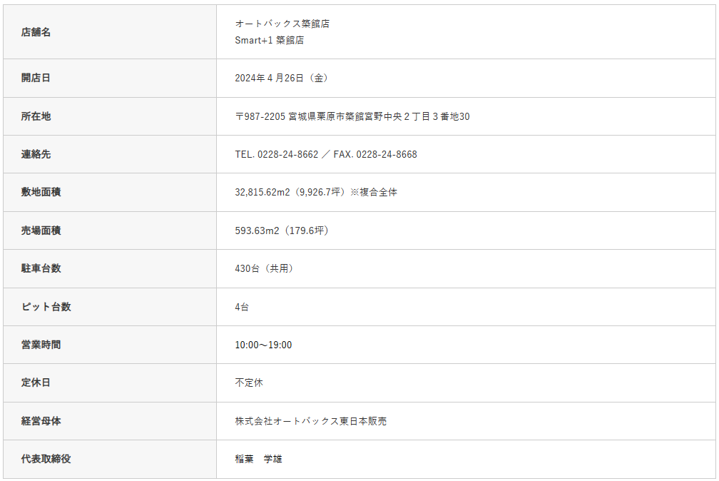 株式会社オートバックスセブン(代表取締役 社長:堀井勇吾)と加盟店契約を結んでいる株式会社オートバックス東日本販売(代表取締役:稲葉学雄)は、2024年4月26日(金)に「オートバックス築館店」を新規オープンいたします。