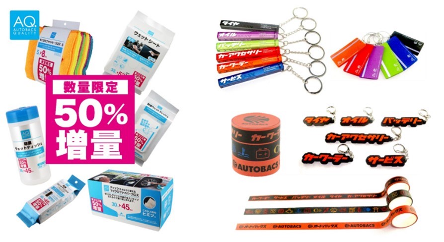 50周年記念特別商品の第一弾として、プライベートブランド「AQ.(オートバックスクオリティ)」の売れ筋6アイテムの50%増量版を価格据え置きにて、全国のオートバックスグループ店舗および特設webサイトにて販売いたします。また、ロゴキーホルダーやマスキングテープなど50周年記念グッズも特設webサイト(https://shop.autobacs.com/ja/sale/50th-goods)にて販売いたします。